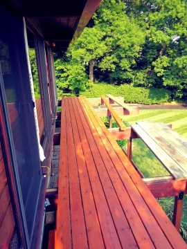Photo shows newly installed cedar decking with flashing and nailing strip assembly. The first courses have been left off to allow detailing at the edge of the house. Unlike the original installation we will not nail the first course in to the house sill. In keeping with contemporary practice we will allow ample space for air flow between the house and the start of the decking.